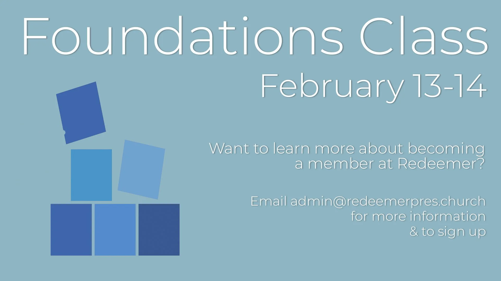 If you are new to Redeemer, would like to learn more, and have not yet gone through the Foundations class, we encourage you to attend an upcoming Welcome to Redeemer Lunch. This will be a laid-back time to meet staff and elders and will include time for any questions you have to better understand the church. This lunch is scheduled for January 25, after the service in the classrooms next to the kitchen. Click here to sign up.